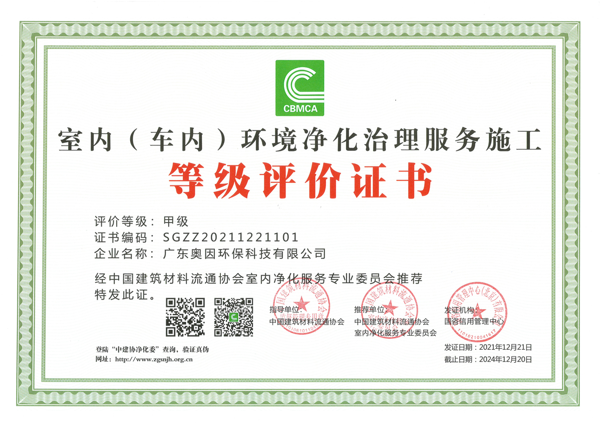 室內(nèi)(車內(nèi))環(huán)境凈化治理服務(wù)施工甲級證書