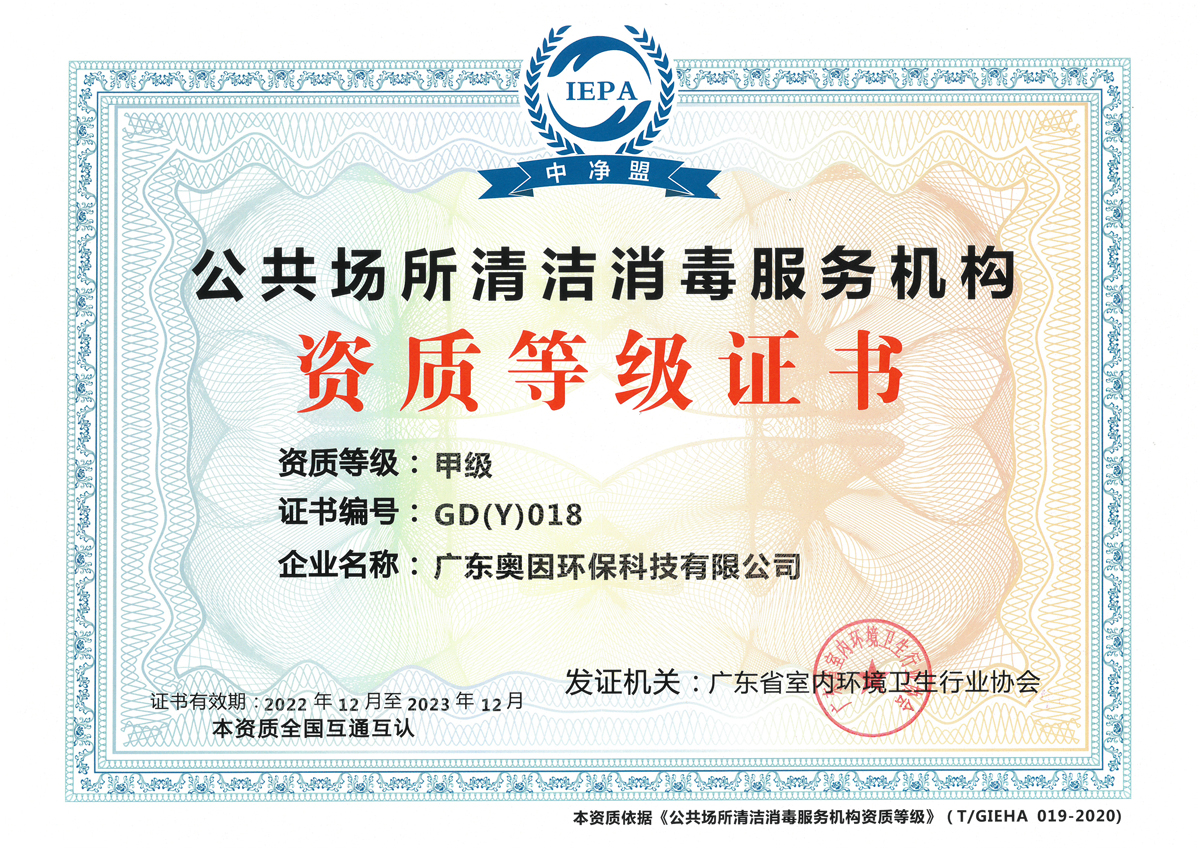 公共場所清潔消毒服務(wù)機(jī)構(gòu)資質(zhì)甲級證書